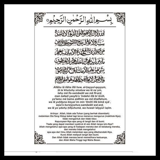 255 Itulah bacaan doa Ayat Kursi. Alloohu laa ilaaha illaa huwal hayyul qoyyuum laa takhudzuhuu sinatuw walaa naum. Bacaan Doa Ayat Kursi 1.
