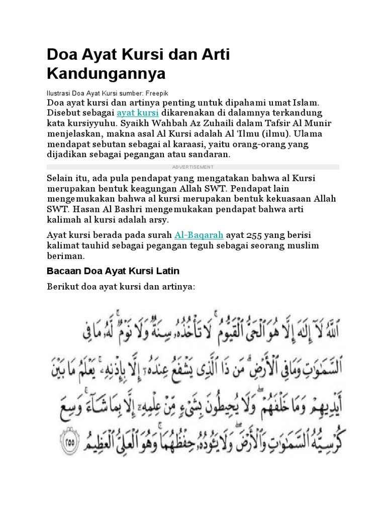 Mendapat cinta dan kasih. Setiap umat muslim dianjurkan untuk memahami bacaan doa ayat kursi dan terjemahan sekaligus agar dapat mengamalkannya dalam kehidupan sehari-hari. Ayat ini merupakan ayat ke-255 dari Surah Al-Baqarah.